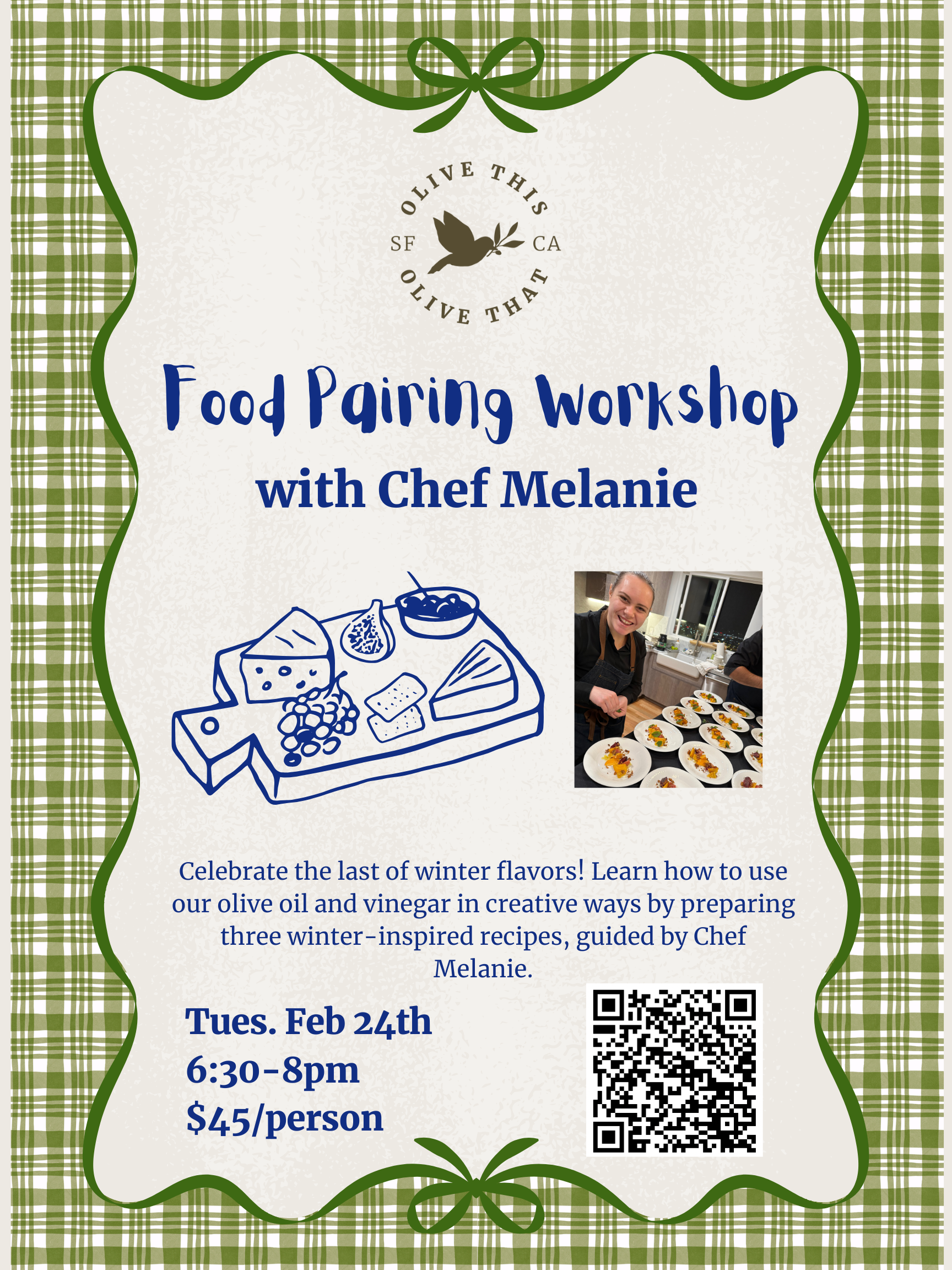 Refresh availabilityCelebrate the final flavors of winter with an intimate, hands-on "Last of Winter" Food Pairing Workshop led with Chef Melanie. In this guided culinary experience, you’ll learn how to thoughtfully pair olive oils and vinegars in creative, unexpected ways while preparing three winter-inspired recipes from start to finish.