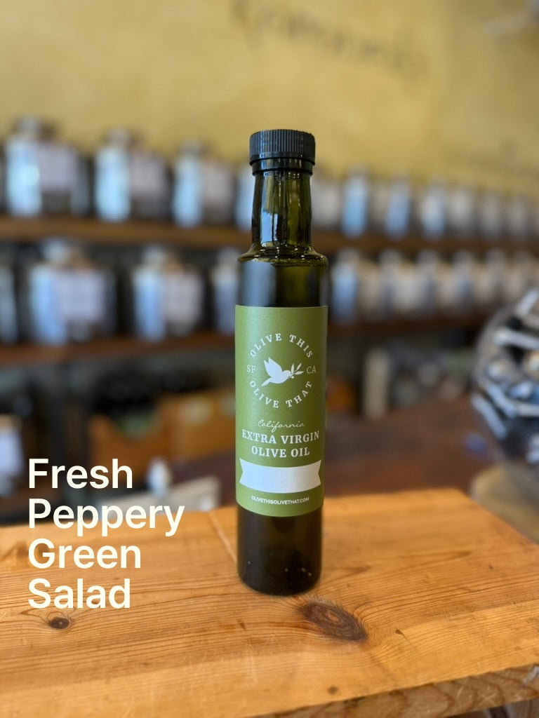 Description: Green garden aromas of tomatoes on the vine, herbs, fresh cut grass, green almond, and green bananas balanced with some bitterness, and finished with a pleasant peppery sensation. A lovely choice for salads, pastas, avocado toast, fish, tomatoes, and beans.